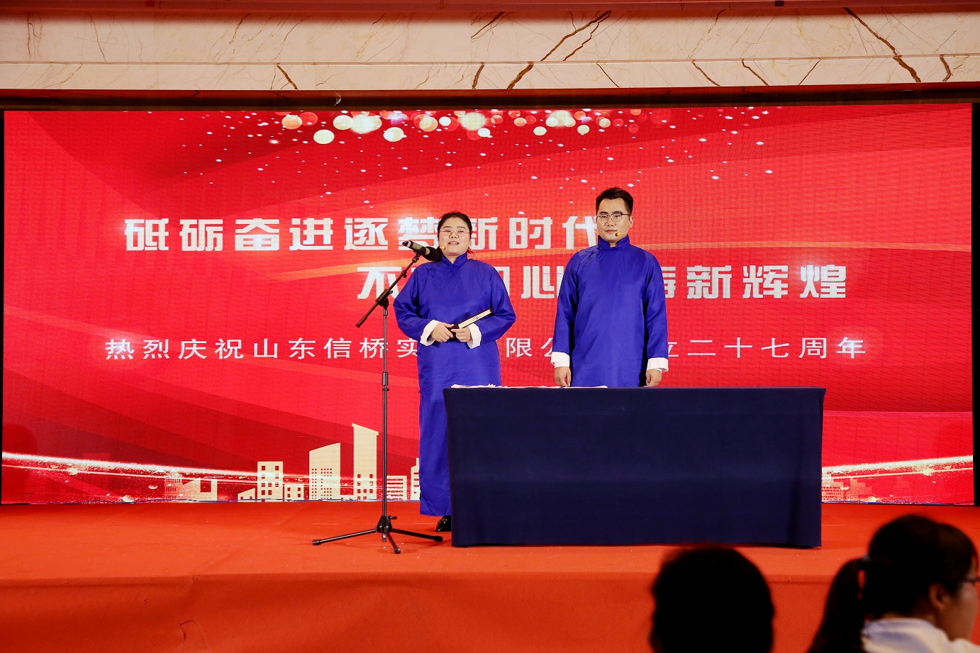 此次慶典晚宴參加人員除了信橋全體員工之外,還有部分老領(lǐng)導(dǎo)和老朋友,大家共同分享了信橋二十七周年的喜悅與精彩。八號上午,慶典開始之前,演員們辛勤排練,燈光師、音響師共同配合,所有人為了晚會都在努力。下午4點(diǎn)58分,晚會正式開始,全體員工與領(lǐng)導(dǎo)集體合影,信橋隊(duì)伍不斷在擴(kuò)大。今年的晚會添加新的互動方式,采用了直播和紅包雨的新形式,是信橋周年慶典的一次新的嘗試。